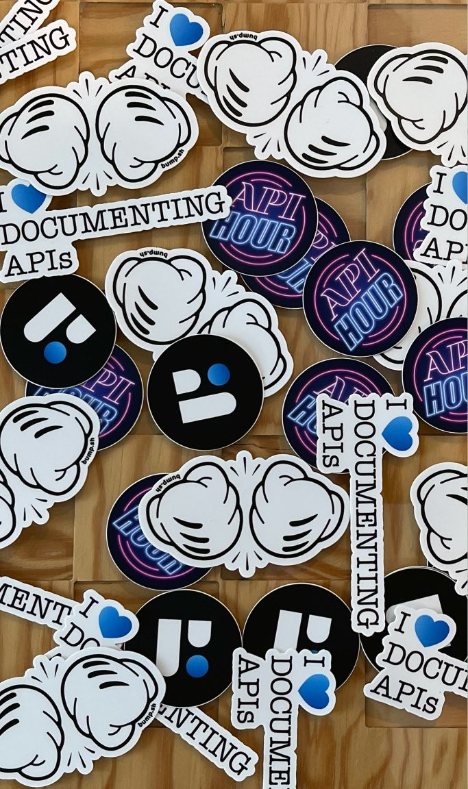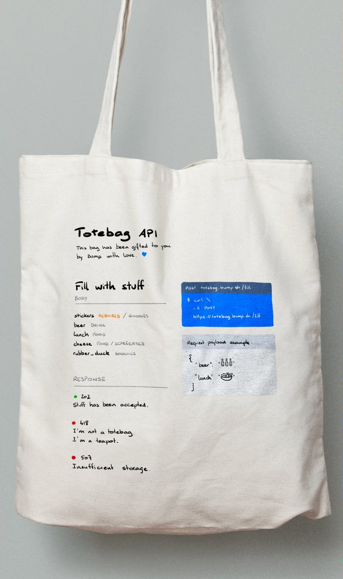 | Can be a famous mouse bumping its fists, I 💙 documenting APIs, API Hour, or the Bump logo | A cotton made bag which can hold your gifts and be re-used indefinitely for your groceries, picnics, shopping, … | A tropical wheat IPA beer. Because we couldn't resist the play on words to make a {REST:API} named beer |